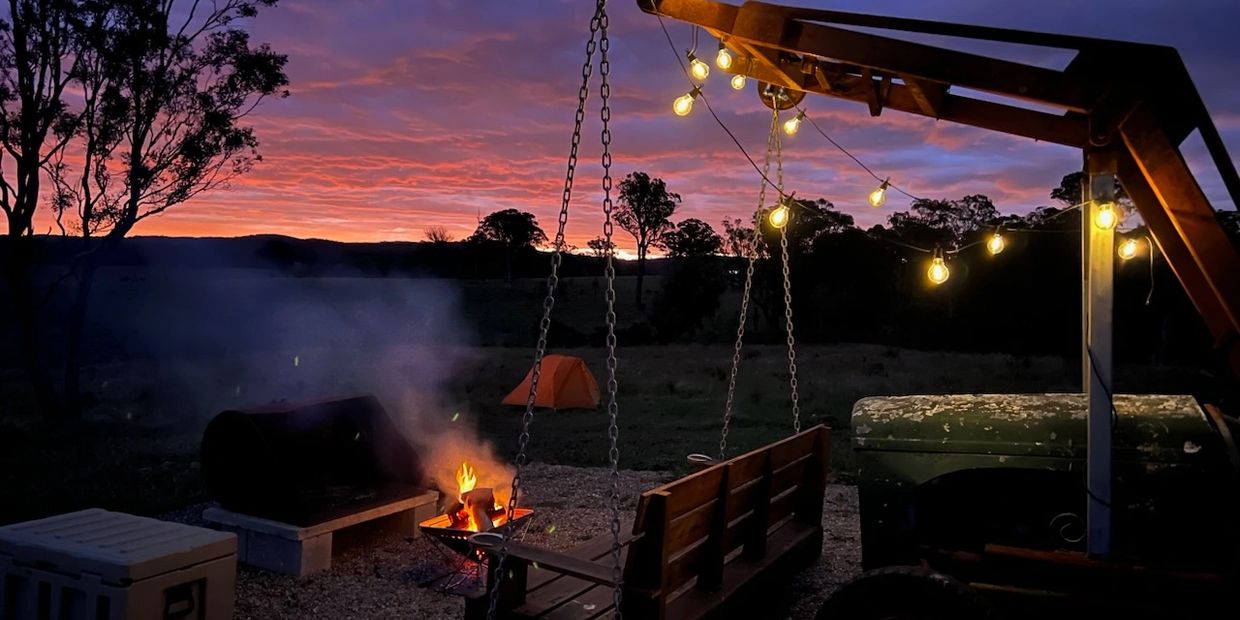 Johnnys Tractor is built around a retro 1950's Massey Fergusson Tractor That has been transformed into a romantic camping spot. With the front loader now a beautiful recycled porch swing and the bucked becoming the firepit, it is the most comfortable setting for a beautiful view of the sunset.