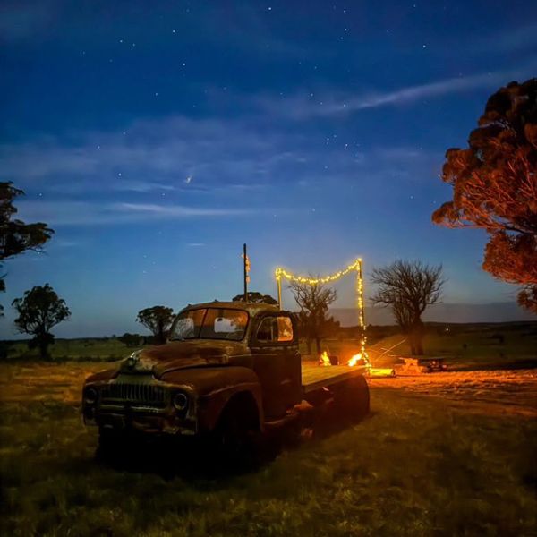 Stargazers hill is the Original campsite at Winyu and offers plenty of space for groups up to 10. With a vintage 1960 International truck from a nearby farm converted into a cool Stargazing Bed and a firepit area for plenty of friends, there is no better place to sitback and relax and watch the stars.